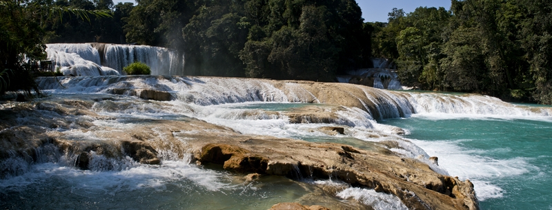 Fem una primera parada a una de les belleses naturals de la regió de Chiapas, a “Agua Azul” un impresionant conjunt de cascades que es forma al descendir el Riu Tulijà de forma escalonada, creant una sèrie d’estancs naturals d’aigua blau turquesa transparent i freda, en els que ens llançem amb força des d’una liana subjectada a un arbre, passant una bona estona a l’estil “Tarzàn”.